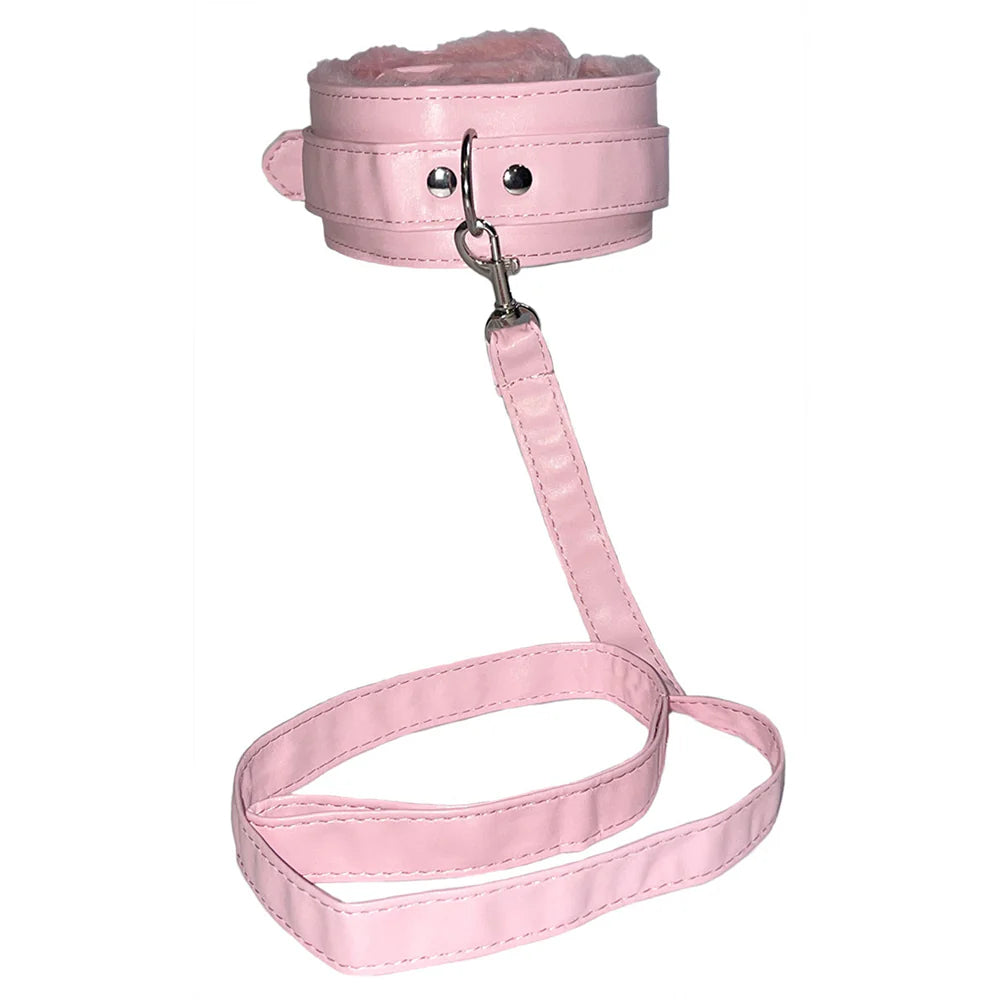 - Pink Vegan Leather Collar and Leash: Indulge any submissive with this soft, comfortable faux fur-lined collar. Collar measures 2" wide and is fully-adjustable. The 30" removable leash adds a playful touch, allowing you to create a connection and explore new levels of intimacy. Connected with a snap hook (included). Nickel-free hardware.
